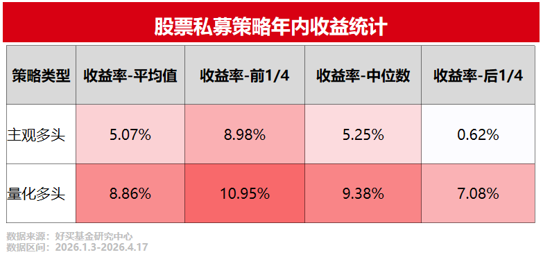 截至4月17日,從整體業(yè)績(jī)水平上看,量化多頭策略的表現(xiàn)仍好于主觀多頭策略。