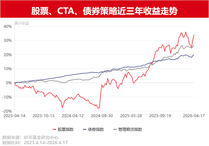 截至今年4月17日,可以看出,年內(nèi)各類私募策略普遍實(shí)現(xiàn)了正收益。股票策略繼續(xù)展現(xiàn)出較強(qiáng)進(jìn)攻性的同時(shí),管理期貨(CTA)策略在大宗商品活躍表現(xiàn)的助力下,也展現(xiàn)出了較好的收益能力。