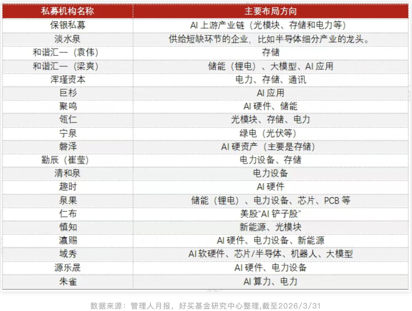 好買基金研究中心數(shù)據(jù)顯示,截至2026年3月底,重點跟蹤的部分私募基金管理人AI布局高度聚焦能源層、芯片層、基礎設施層,當下供需關系比較緊張的光模塊、高速存儲、儲能及電力設備成為一致重倉方向,多家百億私募明確將“光+存儲”列為2026年核心主線。