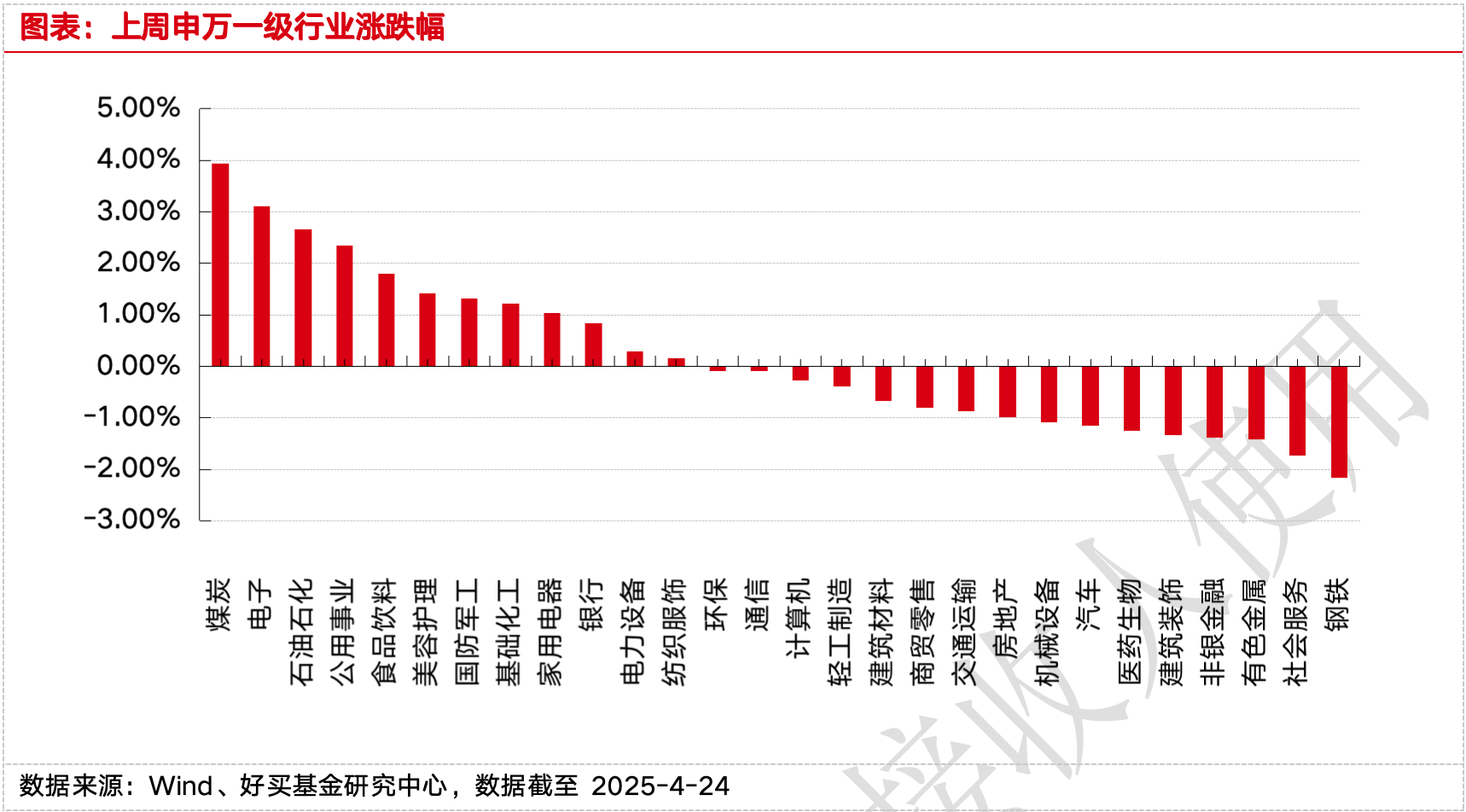 其中,煤炭、電子、石油石化表現(xiàn)居前,漲跌幅分別為3.93%、3.11%、2.66%,傳媒、綜合、農(nóng)林牧漁表現(xiàn)居后,漲跌幅分別為-2.69%、-3.00%、-3.15%。