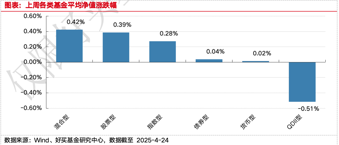 上周,國內(nèi)權(quán)益基金普遍上漲,其中股票型基金平均上漲0.39%,指數(shù)型基金上漲0.28%。