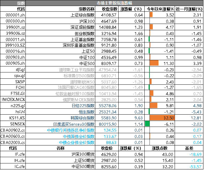 31個(gè)申萬一級行業(yè)中有26個(gè)行業(yè)上漲。其中,通信、電力設(shè)備、機(jī)械設(shè)備表現(xiàn)居前,漲跌幅分別為2.84%、2.18%、2.05%,有色金屬、石油石化、農(nóng)林牧漁表現(xiàn)居后,漲跌幅分別為-0.64%、-1.81%、-2.02%。滬市有1691只個(gè)數(shù)上漲,占比73.30%,深市有2173只個(gè)數(shù)上漲,占比75.37%。非ST個(gè)股中,69只個(gè)股漲停,6只個(gè)股跌停。股指期貨主力合約均上漲,但漲幅弱于指數(shù)。
