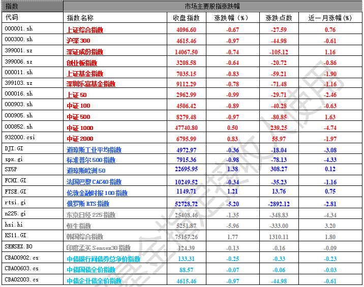 昨日,滬深兩市雙雙收跌。截止收盤,上證綜指收于4096.60點,跌27.59點,跌幅為0.67%;深成指收于14067.50點,跌105.12點,跌幅為0.74%;滬深300收于4615.46點,跌44.98點,跌幅為0.97%;創(chuàng)業(yè)板收于3208.58點,跌20.72點,跌幅為0.64%。兩市成交26475.45億元,較前一日成交額增加20.33%。大盤股強(qiáng)于小盤股。中證100下跌0.89%,中證500下跌0.97%。31個申萬一級行業(yè)中有7個行業(yè)上漲。其中,煤炭,綜合,計算機(jī)表現(xiàn)居前,漲跌幅分別為2.92%、2.77%、1.61%,美容護(hù)理,交通運輸,通信表現(xiàn)居后,漲跌幅分別為-2.17%、-2.34%、-2.38%。滬市有550只個數(shù)上漲,占比24.50%,深市有815只個股上漲,占比27.89%。非ST個股中,47只個股漲停,7只個股跌停。股指期貨主力合約漲跌不一,其中,3只期指好于現(xiàn)貨指數(shù)。