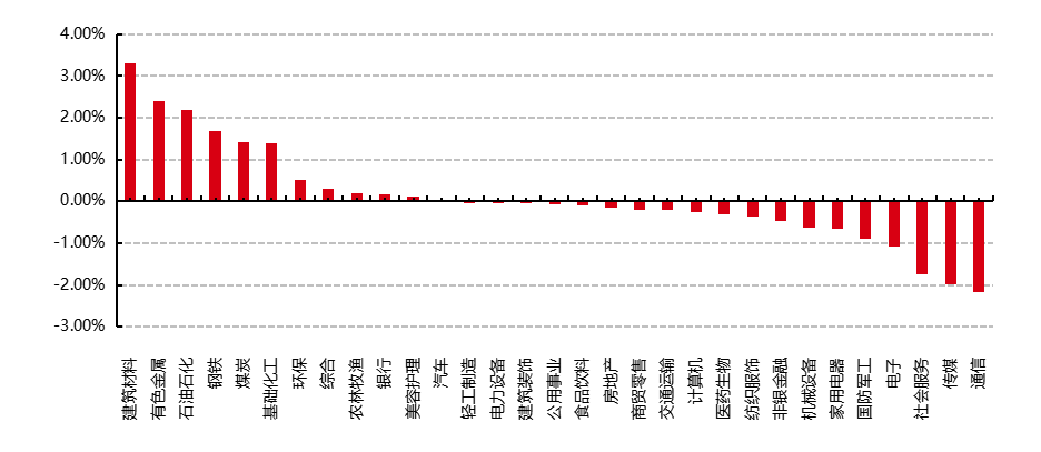 31個(gè)申萬一級行業(yè)中有17個(gè)行業(yè)上漲。其中,煤炭、電力設(shè)備、基礎(chǔ)化工表現(xiàn)居前,漲跌幅分別為2.53%、2.43%、2.08%,傳媒、國防軍工、綜合表現(xiàn)居后,漲跌幅分別為-1.17%、-1.37%、-1.98%。