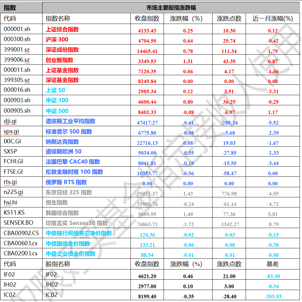 昨日,滬深兩市雙雙收漲。截止收盤,上證綜指收于4133.43點(diǎn),漲10.30點(diǎn),漲幅為0.25%;深成指收于14465.41點(diǎn),漲111.34點(diǎn),漲幅為0.78%;滬深300收于4704.50點(diǎn),漲29.74點(diǎn),漲幅為0.64%;創(chuàng)業(yè)板收于3349.53點(diǎn),漲43.39點(diǎn),漲幅為1.31%。兩市成交25083.78億元,較前一日交易量增加4.61%。大盤股強(qiáng)于小盤股。中證100上漲0.80%,中證500下跌0.08%。