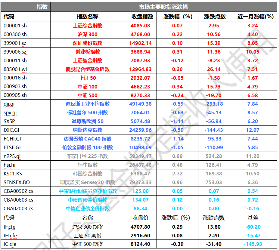 31個(gè)申萬(wàn)一級(jí)行業(yè)中有17個(gè)行業(yè)上漲。其中,煤炭(申萬(wàn))、公用事業(yè)(申萬(wàn))、輕工制造(申萬(wàn))表現(xiàn)居前,漲跌幅分別為2.31%、1.14%、1.02%,商貿(mào)零售(申萬(wàn))、計(jì)算機(jī)(申萬(wàn))、綜合(申萬(wàn))表現(xiàn)居后,漲跌幅分別為-0.81%、-1.84%、-1.85%。滬市有929只個(gè)數(shù)上漲,占比47.04%,深市有976只個(gè)數(shù)上漲,占比35.48%。非ST個(gè)股中,56只個(gè)股漲停,15只個(gè)股跌停。股指期貨主力合約漲跌不一,其中,2只期指好于現(xiàn)貨指數(shù)。