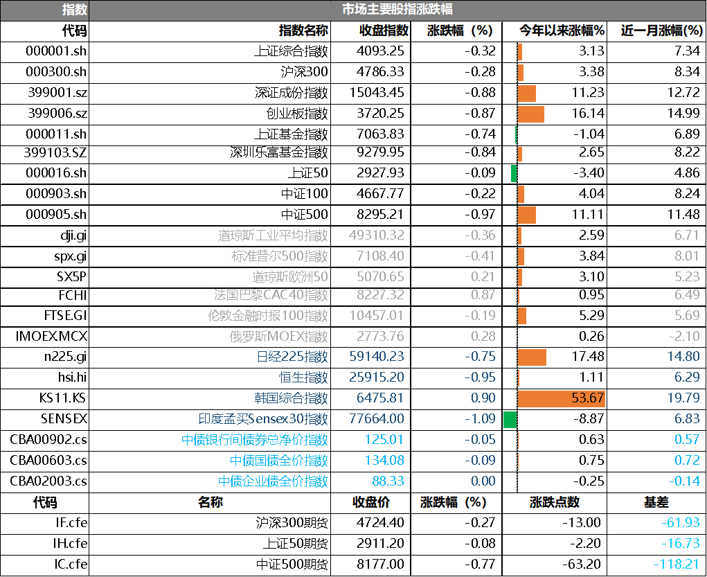 昨日,滬深兩市雙雙收跌。截止收盤,上證綜指收于4093.25點(diǎn),跌幅為0.32%,今年漲幅3.13%;深成指收于15043.45點(diǎn),跌幅為0.88%,今年漲幅11.23%;滬深300收于4786.33點(diǎn),跌幅為0.28%,今年漲幅3.38%;創(chuàng)業(yè)板收于3720.25點(diǎn),跌幅為0.87%,今年漲幅16.14%。兩市成交28044.92億元,較前一日交易量增加9.56%。大盤股強(qiáng)于小盤股。中證100下跌0.22%,中證500下跌0.97%。