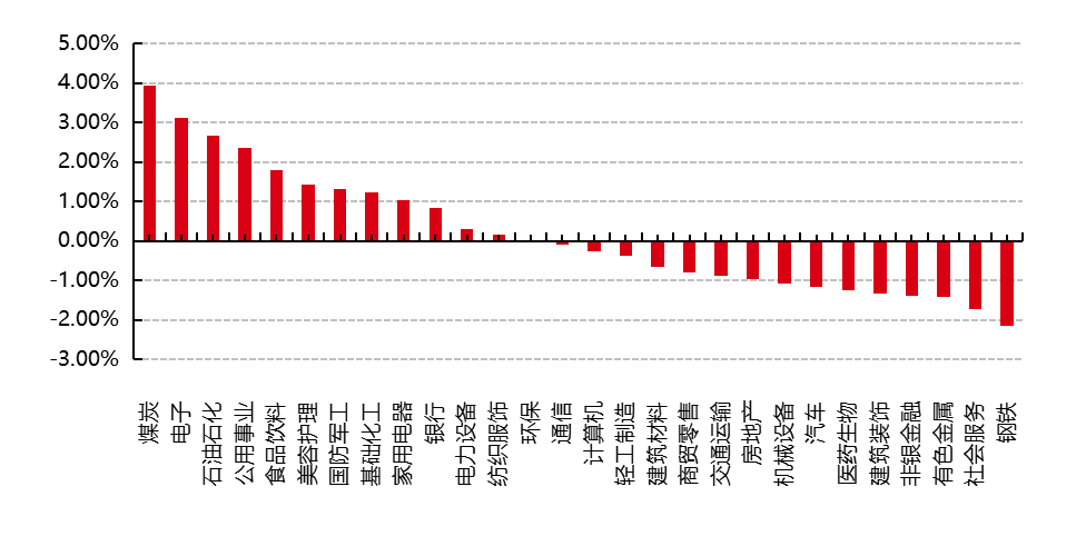 31個(gè)申萬一級行業(yè)中有12個(gè)行業(yè)上漲。其中,煤炭、電子、石油石化表現(xiàn)居前,漲跌幅分別為3.93%、3.11%、2.66%,傳媒、綜合、農(nóng)林牧漁表現(xiàn)居后,漲跌幅分別為-2.69%、-3.00%、-3.15%。