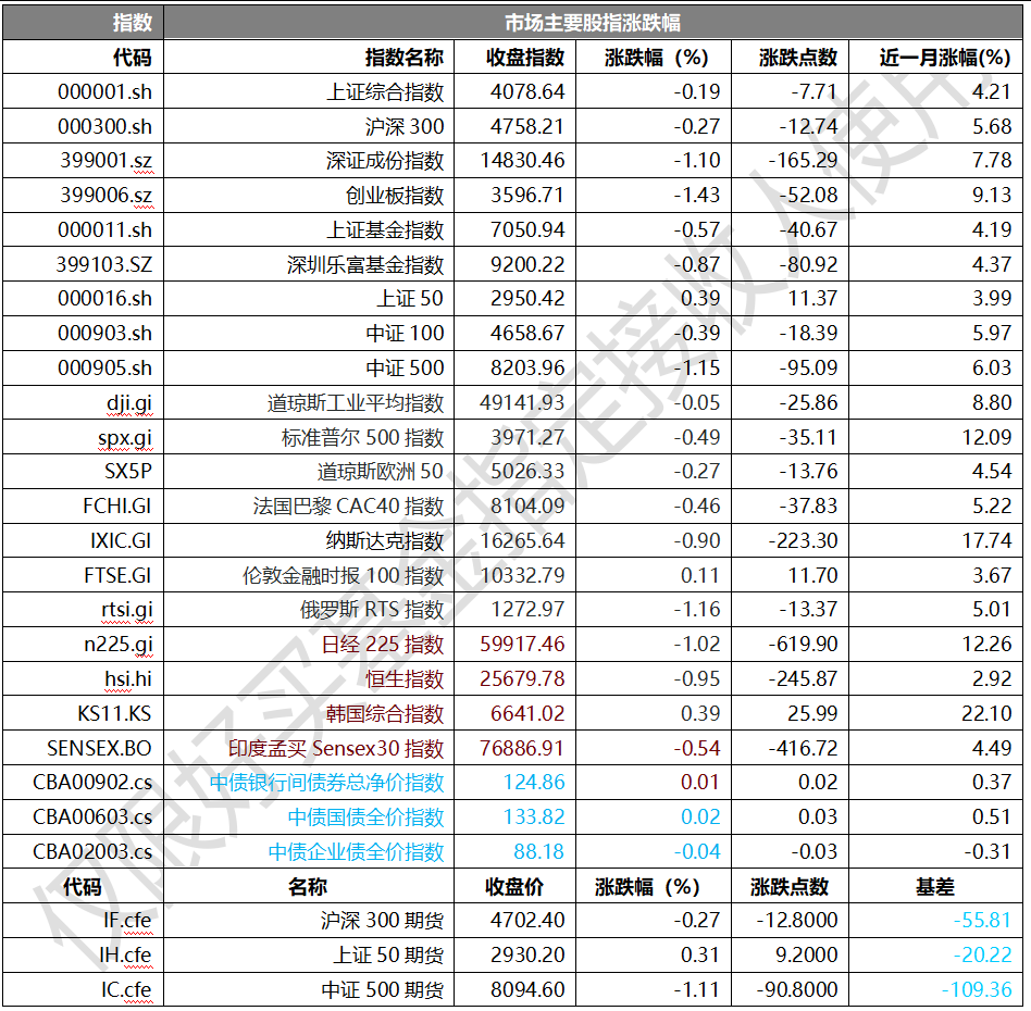 31個申萬一級行業(yè)中有12個行業(yè)上漲。其中,煤炭、綜合、石油石化表現(xiàn)居前,漲跌幅分別為2.81%、2.19%、1.96%,社會服務(wù)、通信、有色金屬表現(xiàn)居后,漲跌幅分別為-2.20%、-2.24%、-2.28%。滬市有804只個數(shù)上漲,占比34.17%,深市有883只個數(shù)上漲,占比30.18%。非ST個股中,58只個股漲停,32只個股跌停。股指期貨主力合約漲跌不一,其中,2只期指好于現(xiàn)貨指數(shù)。